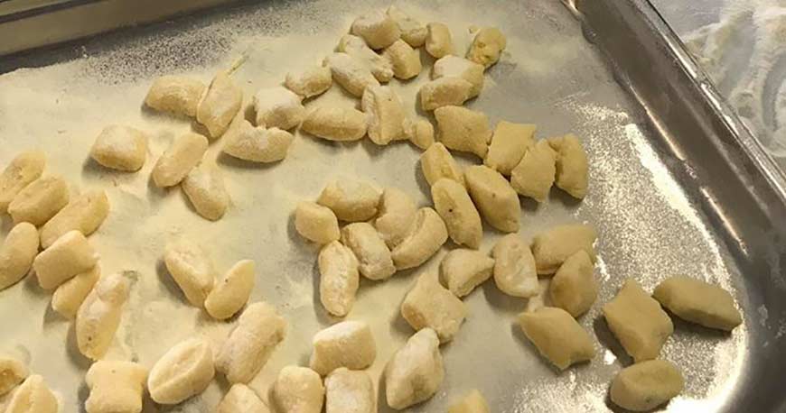- Den Teig in lange Rollen formen, in kleine Gnocchi schneiden und in gesalzenem Wasser kochen